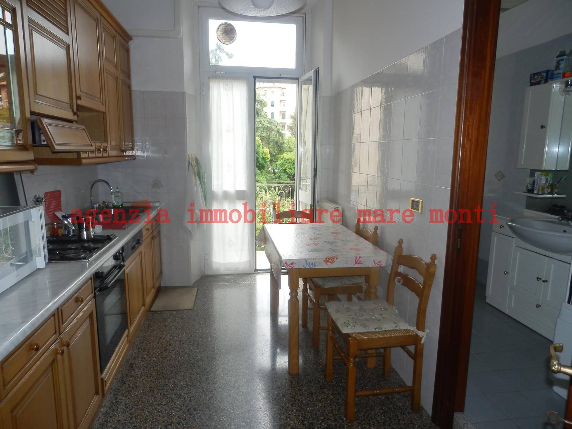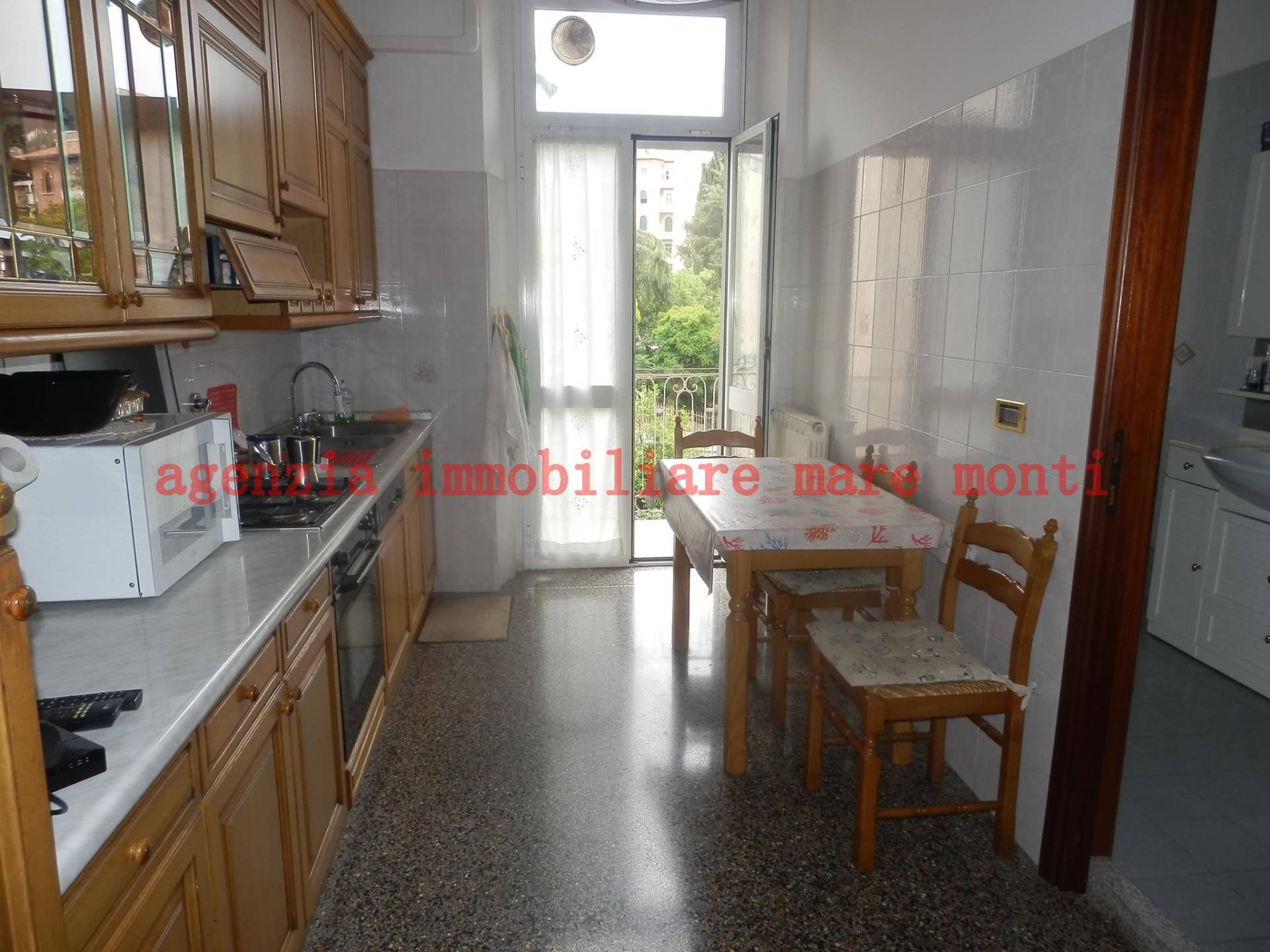 L'alloggio, molto luminoso, gode di assoluta tranquillità e si compone di classico ingresso alla genovese, 2 ampie camere, sala con balcone, cucina abitabile con balcone, bagno finestrato, camera buia.