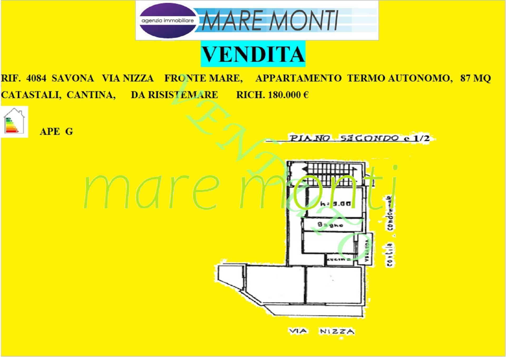 Savona Via Nizza fronte mare vendesi quadrilocale posto al 2 piano e 1/2 senza ascensore dotato di riscaldamento autonomo, l'alloggio con una ottima esposizione solare si compone di ingresso, 3 camere (di cui due con balcone vista mare), soggiorno cucinotto e balcone verandato, bagno finestrato, completa la propreità una cantina posto al piano interrato; l'alloggio necessita di lavori di riammodernamento, mentre le parti comuni del fabbricato sono in ottime condizioni.